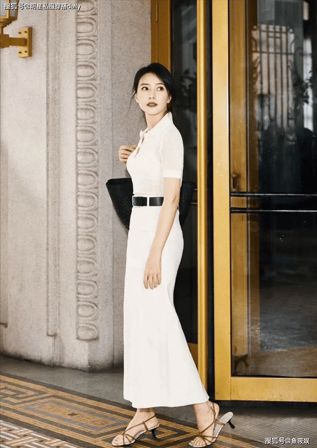 为了让这套造型更具层次感,高圆圆搭配了一双棕色低跟凉鞋。棕色作为大地色系的一种,与白色搭配在一起,既不会显得突兀,又能增添一抹温润的成熟感。凉鞋的鞋跟高度约为 3 厘米,这种高度的鞋跟既不会给脚部带来过大负担,又能起到一定的增高效果,让身姿更显挺拔。此外,她还搭配了一个简约的米色腋下包,包身小巧精致,仅能容纳手机、口红等日常必需品,避免了大包带来的沉重感,与整体简约的穿搭风格相呼应。