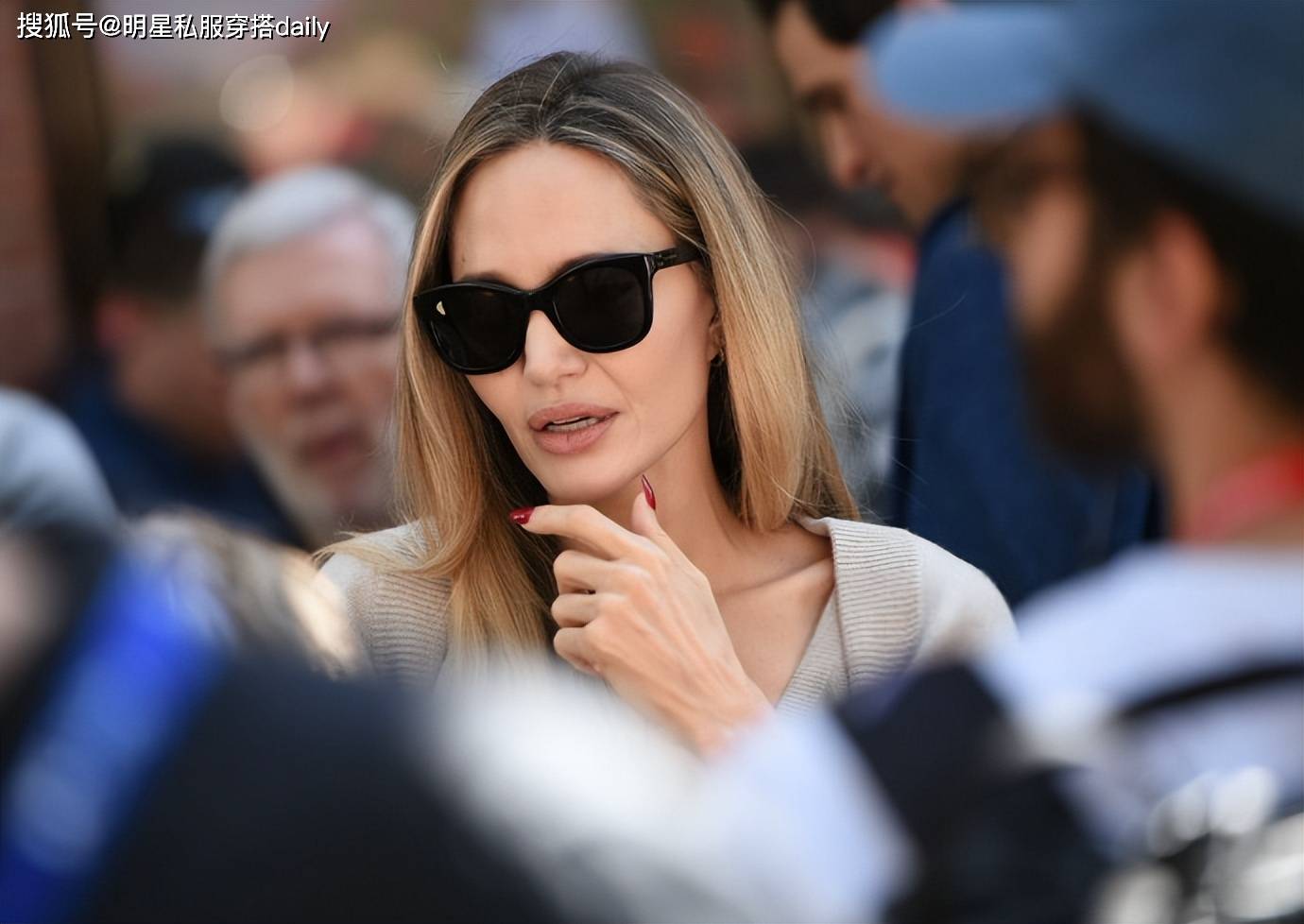 例如她的浅卡其色羊绒针织连衣裙,V领设计让颈肩线条显得柔和,搭配金色长发,整体色调温柔而端庄,轻松呈现出高级感。细节处的点缀也不能忽视,如红色指甲和墨镜,给整体造型带来微妙的亮点,仿佛在低调中释放出新的惊喜。