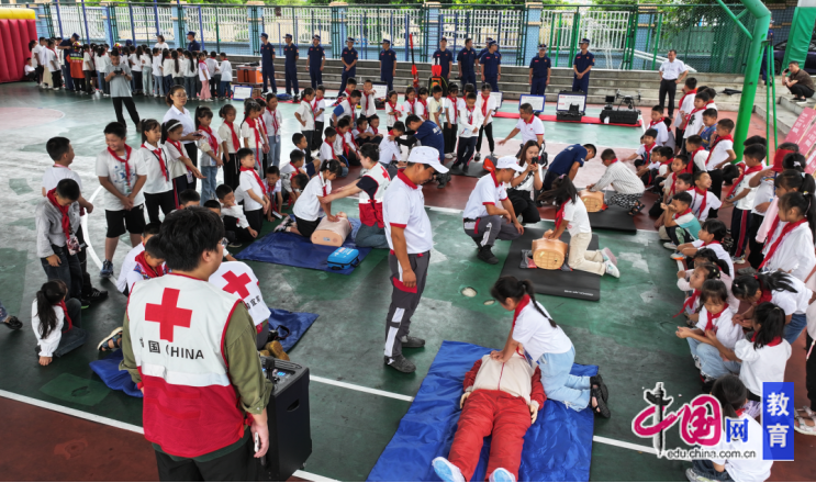 与此同时,巡司镇中心校开展了自救互救知识科普与体验。在该校篮球场,筠连县应急管理局、县消防救援大队、县气象局等单位及筠爱志愿服务队为同学们教授了自救互救知识,展示了无人搜救机与无人搜救船等各种高科技救援设备。在消防逃生演练中,师生们在消防队员的带领下弯腰捂鼻穿越模拟烟雾通道,熟练掌握火灾逃生方法。在心肺复苏教学区,志愿者用人体模型分步讲解按压要领,并指导同学们完成实操。观摩后,省市领导对筠连县防灾减灾知识普及工作给予了充分的肯定。