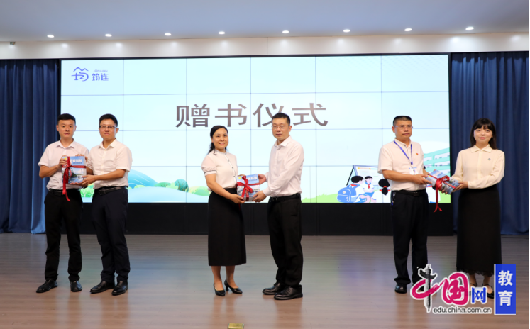 瞿亮、熊杰、梁修煜向筠连县捐赠了《四川省小学生地质灾害防范与自救》科普书籍及物资;熊杰向巡司镇中心校教师志愿者代表授予“青春志愿·守护生命”地灾防治志愿服务队旗帜;巡司中心校负责人在会上致词。