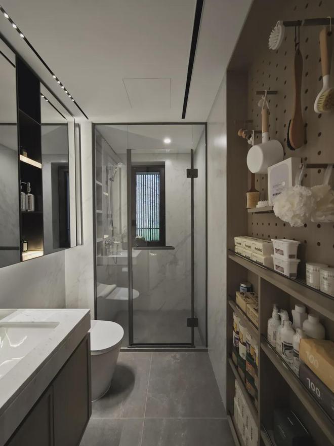 環置地中心望云售楼处电话:【预约☎】另外,在卫生间部分,项目在台盆对面做了一个墙体的向后延伸,再次做出一个超大尺寸的洞洞墙板和储物柜,原本只有镜柜的收纳空间瞬间就扩大了不止一倍。